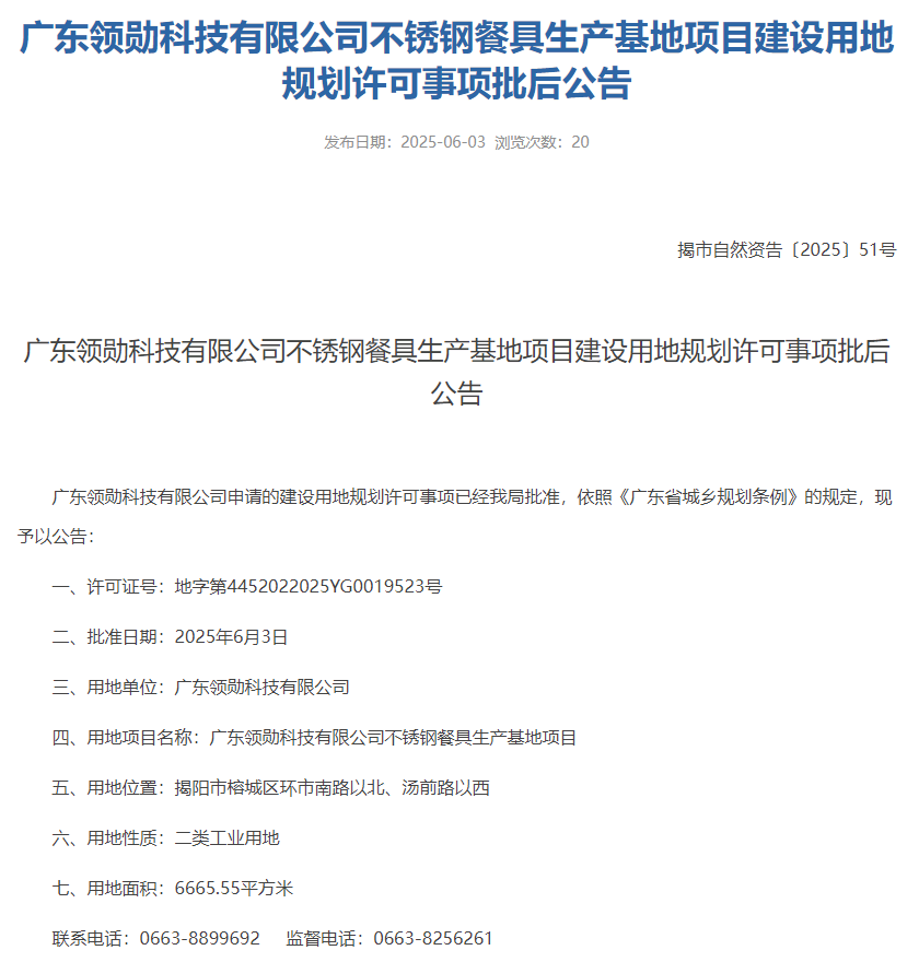 2025年6月3日,揭陽市自然資源局就廣東領(lǐng)勛科技有限公司不銹鋼餐具生產(chǎn)基地項目建設(shè)用地規(guī)劃許可事項作出批后公告。